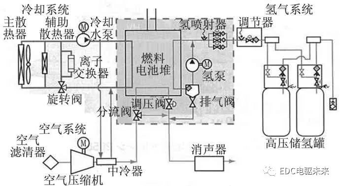 燃料电池系统由进行发电的燃料电池堆、供应氢燃料的氢气系统、供应氧气的空气系统,以及冷却系统所构成(图6)[1]。燃料电池堆发出的电能通过燃料电池升压转换器向主驱动电机及高电压蓄电池等高压系统供电(图7)[2]。就对燃料电池堆发电有着重要影响的电解质传导性而言,其灵敏度会随着附近环境的相对湿度而发生显著变化。不仅如此,反应过程中生成的水会影响到燃料电池堆内的燃料供应过程,因而对生成水的管理可谓至关重要。本文论述了基于燃料电池堆水管理而进行的相关设计与系统控制。