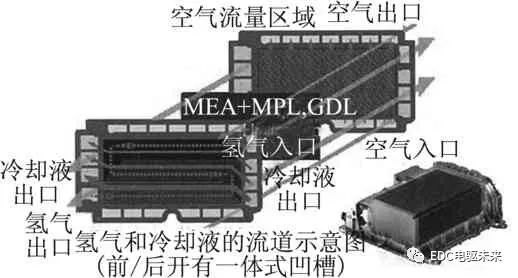 燃料电池堆通过设计单电池的电极面积和单电池数量,从而获得所需的电能。在通常情况下,单电池由作为氢气与氧气反应部位的膜电极总成(MEA)、显微渗透层(MPL)、气体扩散层(GDL)、用于从外部供应氢气和空气的气体通道,以及隔板等部件构成(图8)[3]。