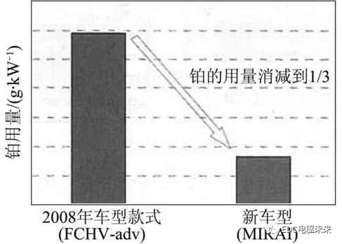 丰田公司通过对燃料电池流道及MEA进行改进,使燃料电池系统实现了高密度化。此外,由于对单电池内部弹簧机构的有效应用,简化了电池的连接构件。同时,由于电池本身的薄型化,缩小了体积尺寸[4]。而且,随着隔板材质的调整,电池全重有效减轻了,使电池具备较高的功率密度(3.1 kW/L与2.0 kW/kg,图9)。结果表明,燃料电池电极铂催化剂的使用量还降低了(图10)。不仅如此,为避免降低接触阻力并确保耐蚀性,隔板的表面处理工艺也从电镀金处理调整为较廉价的聚合非晶碳镀层(PAC),从而显著降低了成本[5]。