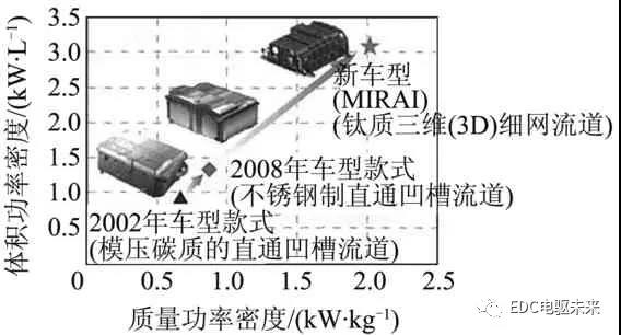 图9 丰田公司燃料电池堆的功率密度发展趋势