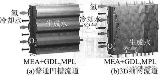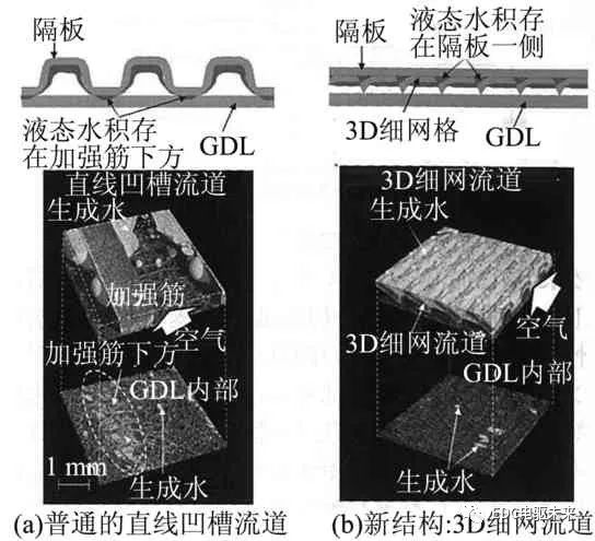 在低温及普通运转温度区,由于发电而生成的水会滞留于空气极侧的电池流道、GDL、MPL及MEA中,从而产生浓度超电压。在通常情况下,与气体流道不接触的GDL及MEA内容易积存液态水。而在丰田的MIRAI车型上配装的燃料电池堆的单元流道结构,采用了3D细网格状结构。在优化了氧气供应并排出液态水的同时,由于隔板表面具有一定亲水性,将液态水导向流道表面,进而降低了浓度超电压(图12、图13)。此外,在GDL内,通过调整碳素纤维与黏合剂的比例以实现最优化。而在MPL方面,通过实现碳黑颗粒的粗颗粒化而降低透水压力,使气体扩散性提高约2倍,进而降低了浓度超电压。