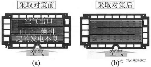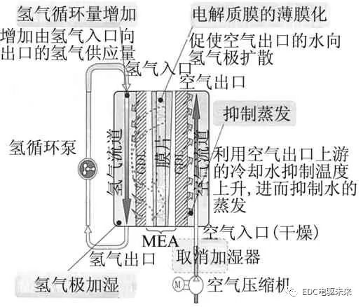为了确保PEFC中电解质的质子传导性能,需使电解质周围环境保持湿润状态。在常规的燃料电池系统中,通过加湿器可排出反应中生成的水,将其返回燃料电池堆并进行加湿处理。配装在MIRAI车型上的TFCS,可通过结构简化以提高可靠性。丰田公司以降低成本为目标,取消了该类加湿器,基于自加湿理念而对各个构件进行设计,由此实现了与以往相似的高温性能(图14)。自加湿的工作机理是在干燥的空气入口处通过氢气极对空气进行加湿。该设计方式不仅兼顾了各个构件,而且与冷却水流量及氢循环泵流量等系统实现了有机结合。