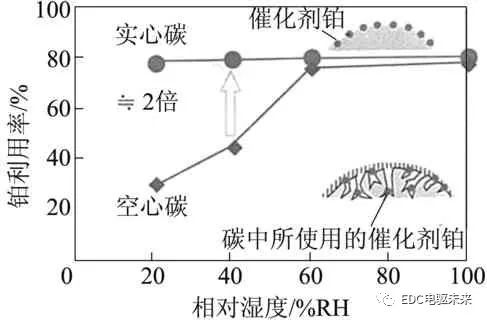 燃料电池在高温状态下运转时,空气极入口湿度会相对较低。在MEA内部的催化剂附近,质子传导性会逐渐恶化,进而会使电阻超电压有所增加。在外观上,催化剂有效表面积减少,使燃料电池性能恶化。通过增加包覆催化剂电解质官能团的方式,以确保催化剂有效表面积的不变。在提高质子传导性的同时,通过电解质/载体碳比率的最佳化及催化剂载体碳的实心化,即使在低湿度环境下,也能有效增加催化剂的表面积。同时,通过该措施还实现了单电池流道形状的最佳化,有效抑制了空气极入口处的干燥趋向。除了针对上述构件的设计过程外,由于系统自身运转条件得以最佳化,即便在高温环境下,单电池的发电过程也可处于稳定运行状态,从而将超电压的发生可能性控制在最小限度以内(图15、图16)[6]。