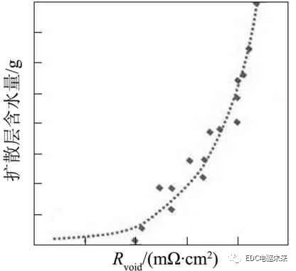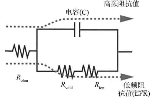 图18示出了常规燃料电池的等效电路[7]。图中Rohm为电解质膜的电阻,Rvoid为GDL的电阻,Rion为电解质的电阻。这些电阻会随着含水率的不同而发生变化。在处于适度的湿润状态时,各部位电阻值均保持在较低状态。在冷却过程中,由于GDL内部液态水大量存在,导致扩散阻力有所增加,所以Rvoid值会相应增大。相反,在高温运转时等含水率较低的状态下,Rohm和Rion会有所增大,并产生电阻超电压。