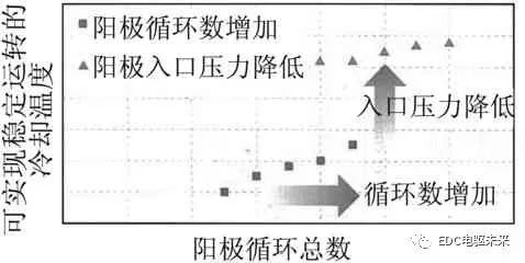 TFCS在高温状态下运转时,改变氢气极的工作条件以进行水管理。为使水得以有效分配到氢气极表面,根据相关运转条件,可通过控制氢气泵以增加氢循环量。在确保了必要的氢循环量之后,通过降低氢气极入口压力的方式,促使氢气极表面的水实现不断流动。由于上述对策的运用,催化剂附近环境较为湿润,即便不采用外部加湿处理,也能有效提高系统运转时的环境温度(图19)[8]。