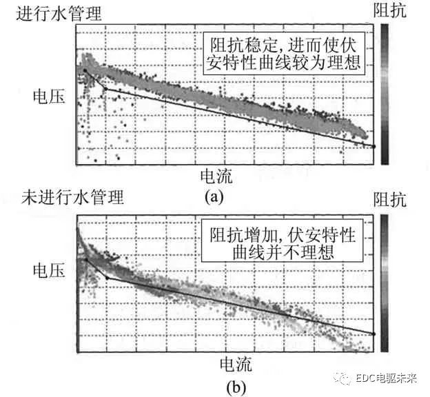 图22 按照是否进行水管理的燃料电池堆特性曲线图对比