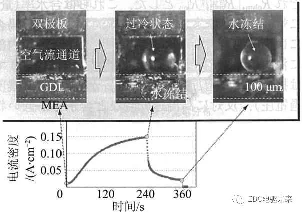 燃料电池系统在0 ℃下起动时面临的主要问题是燃料电池系统内部的残留水及由于发电过程中生成的水会出现冻结现象,无法向MEA及时供应工作所需的氢气与氧气。由此面临的最恶劣情况即为燃料电池无法正常发电。
