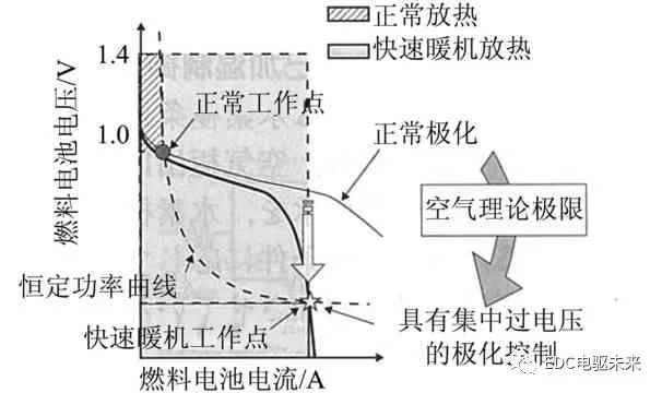 燃料电池堆在发电时,随着各类能量损失的出现,会同时出现发热现象。燃料电池堆处于正常运转工况时,须使发热量处在最小限度内,并高效运转。如需实现燃料电池堆的快速升温,应降低反应过程所需的空气量,进而逐渐增大浓度超电压(图26)。