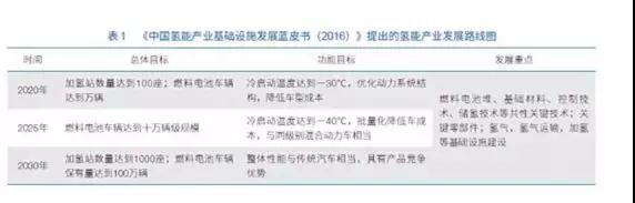 2016 年 10 月,中国标准化研究院资源与环境分院和中国电器工业协会发布的《中国氢能产业基础设施发展蓝皮书(2016)》首次提出了我国氢能产业的发展路线图(表 1)。