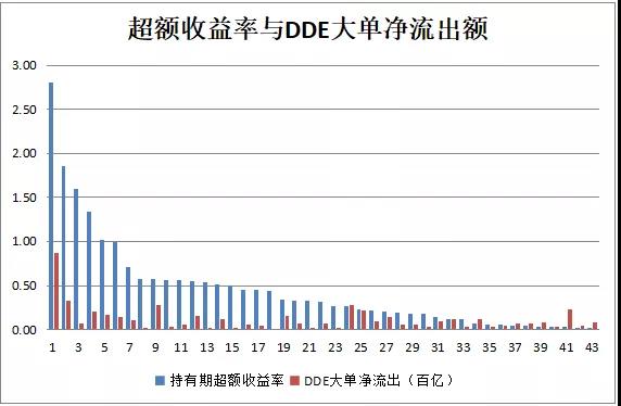 在2018年10月—2019年5月期间,除中泰股份之外,所有公司的DDE大单均为净流出,净流出额总计718.5亿元。超额收益大于零的股票DDE大单净流出分布如下图所示: