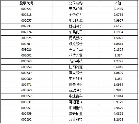 Z值是衡量公司财务风险的重要指标之一,通常认为Z<1.8,未来两年财务失败的可能性非常大; 1.8≤Z<2.7,财务有失败的可能性较大,灰色区;2.7≤Z<2.9, 灰色区;大于2.9则财务上非常安全。氢能概念上市公司Z值警示指数小于1.8的公司共33家。其中股票收益前20名公司Z值分布如下: