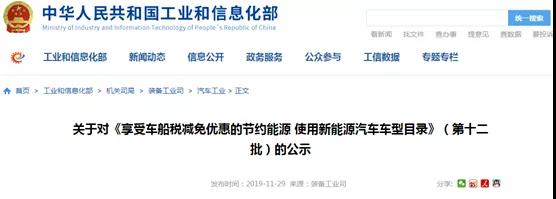11月29日,工信部公示第12批《享受车船税减免优惠的节约能源使用新能源汽车车型目录》名单。