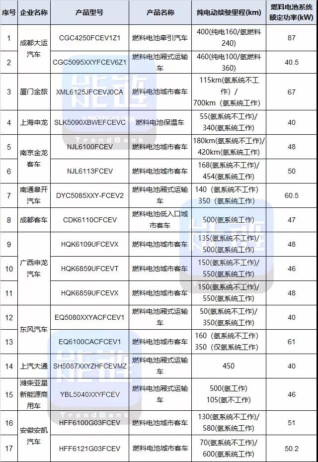 在公示名单的17款燃料电池商用车中,有10款为燃料电池客车,5款为燃料电池厢式运输车,1款燃料电池牵引汽车,1款燃料电池保温车。
