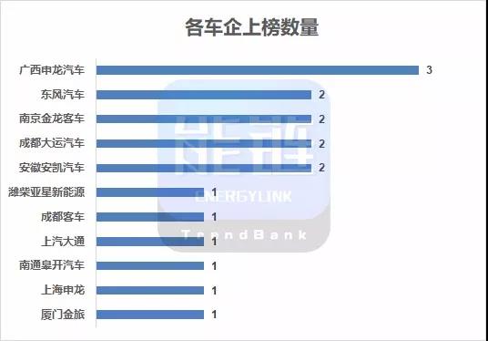 其中,广西申龙汽车上榜3款,成都大运汽车、南京金龙客车、东风汽车、安徽安凯汽车均上榜2款,其他车企均上榜1款。