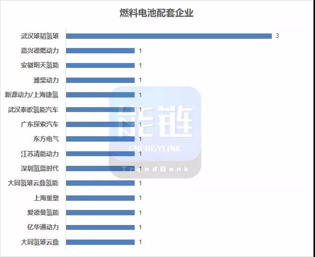 从燃料电池系统配套企业来看,为这17款车配套燃料电池系统的企业是武汉雄韬氢雄配套3款;大同氢雄云鼎、亿华通动力、爱德曼氢能、上海重塑、大同氢雄云鼎氢能、深圳氢蓝时代、江苏清能动力、东方电气、广东探索汽车、武汉泰歌氢能汽车、潍柴动力、安徽明天氢能、嘉兴德燃动力各配套1款;新源动力/上海捷氢两家企业共同为上汽大通的燃料电池厢式运输车配套。