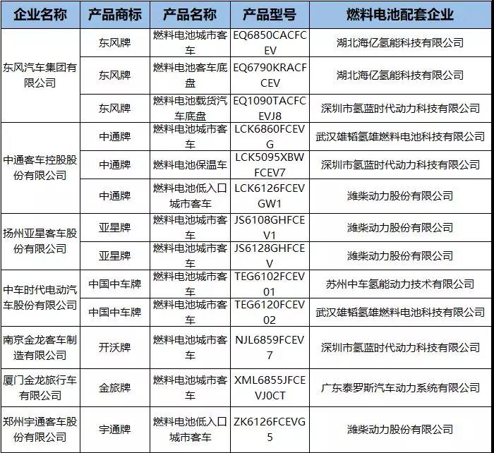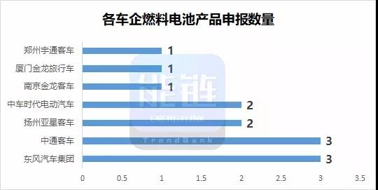 如上表所示,参与本次申报的燃料电池产品企业分别是东风汽车集团有限公司、中通客车控股股份有限公司、扬州亚星客车股份有限公司、中车时代电动汽车股份有限公司、南京金龙客车制造有限公司、厦门金龙旅行车有限公司、郑州宇通客车股份有限公司。