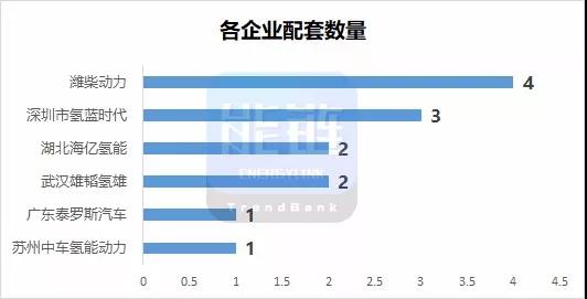 如上图所示,潍柴动力配套最多,为4款,深圳市氢蓝时代配套第二,为3款,武汉雄韬氢雄、湖北海亿氢能配套第三,为2款,苏州中车氢能动力、广东泰罗斯配套1款。