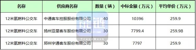 其中,中通客车中标氢燃料公交车40辆,中标金额10396万元,亚星客车与宇通客车均中标氢燃料公交车30辆,中标金额分别为7799.4万元,7797万元。