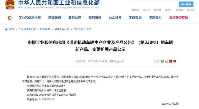 近日,工业和信息化部在官方网站公示《道路机动车辆生产企业及产品公告》(第330批)的车辆新产品、变更扩展产品。