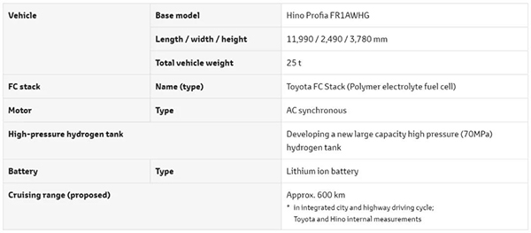 拟联合开的重型燃料电池卡车基于日野Profia(大约12米长,25吨重),并且将充分利用丰田和日野多年来积累的技术进行升级。底盘经过专门设计,具有适合燃料电池车辆的最佳装配,同时通过全面轻量化以确保足够的负载能力。动力系统配备了两个丰田新一代Mirai燃料电池电堆,并采用基于日野公司重型混合动力汽车技术的车辆驾驶控制系统。此外,续航里程约为600 km,旨在满足作为商用车的高标准的环保性能和实用性能。