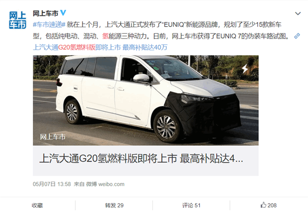 补贴最高40万元!上汽氢燃料MPV亮相:加氢5分钟续航550公里
