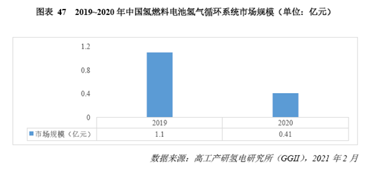 从市场规模来看,2020年国内氢循环系统的市场规模预计为0.41亿元,同比2019年下降了63%,下降原因主要是出货量减少和氢循环泵价格的下降。