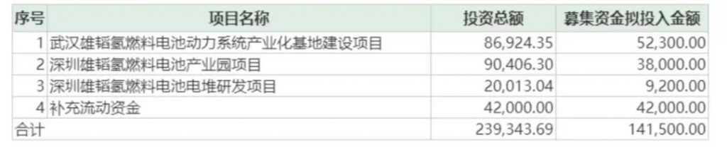 此次拟非公开发行募集资金在扣除发行费用后将全部用于如下项目:(1)武汉雄韬氢燃料电池发动机产业化基地建设项目;(2)深圳雄韬氢燃料电池产业园项目;(3)深圳雄韬氢燃料电池电堆研发项目;(4)补充流动资金。