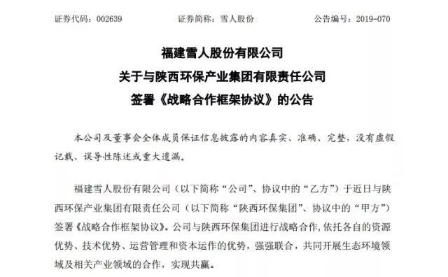 昨日晚间,雪人股份发布公告,称公司于近日与陕西环保产业集团有限责任公司(“陕西环保集团”)签署《战略合作框架协议》。