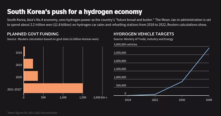 (韩国政府计划在2018-2022年间在氢燃料电池汽车和加氢站上投入约180亿美元,路透制图)