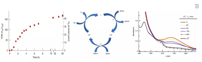 Turro教授研究团队尝试仅用一个分子(一种元素铑的形式)制造催化剂,这意味着损失的能量更少,并实现从整个可见光谱收集能量。研究人员使用LED将光照射到含有活性分子的酸性溶液上,氢气便产生了。该系统在低能量的近红外光下的效率比以前利用紫外线光子的单分子系统高出近25倍。