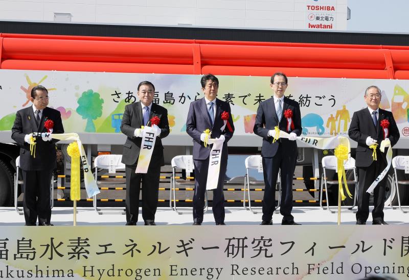 安倍表示,因2011年核电站事故而遭受重创的福岛,现在正打开面向未来氢能社会的全新一页。