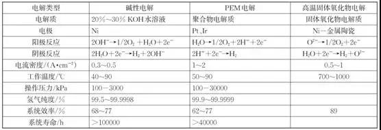 下表为三种水电解技术的指标对比。可以发现,碱性电解水技术具有使用寿命长的优点,但电解质使用的KOH或者NaOH溶液会污染环境,该技术电流密度也较低。PEM电解水具有电流密度大、氢气纯度高等优点,安全性和操作简便性也较好,但由于成本等原因,目前仅适用于小规模的氢气生产。高温固体氧化物电解技术系统效率高于另外两种技术,但其工作温度过高,目前仍处于研究阶段。