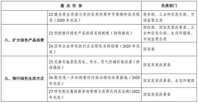 (九)促进服务业绿色发展。在市政公用工程设施和城乡公共生活服务设施的规划、建设、运营、管理有关标准和规范制修订中,全面贯彻绿色发展理念,提升绿色化水平。完善绿色物流建设支持政策。加快建立健全快递、电子商务、外卖等领域绿色包装的法律、标准、政策体系,减少过度包装和一次性用品使用,鼓励使用可降解、可循环利用的包装材料、物流器具。健全再生资源分类回收利用等环节管理和技术规范。(住房城乡建设部、自然资源部、国家发展改革委、工业和信息化部、司法部、生态环境部、交通运输部、商务部、市场监管总局、铁路局、民航局、邮政局等按职责分工负责)