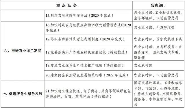 (八)推进农业绿色发展。以绿色生态为导向,创新农业绿色发展体制机制,开展农业绿色发展支撑体系建设,创新技术体系、健全标准体系、延伸产业体系、强化经营体系、完善政策体系,为农业绿色发展提供保障。大力推进科学施肥,建立有机肥替代化肥推广政策机制。实施化学农药减量替代计划,建立生物防治替代化学防治推广政策机制,支持研发推广农作物病虫害绿色防控技术产品。制定农用薄膜管理办法,建立全程监管体系,支持推广使用生物可降解农膜。加快制定农药包装废弃物回收处理管理办法。完善农作物秸秆综合利用制度,以县为单位整体推进秸秆全量化综合利用。以肥料化和能源化为主要利用方向,落实畜禽粪污资源化利用制度。完善落实水产养殖业绿色发展政策,依法加强养殖水域滩涂统一规划。建立饲料添加剂和兽药使用规范,健全病死畜禽无害化处理机制。稳步推进耕地轮作休耕制度试点。健全农业循环经济推广制度,建立农业绿色生产技术推广机制。落实农业绿色发展税收支持政策。建立健全农业绿色发展相关标准,加快清理、废止与农业绿色发展不适应的标准和行业规范。(农业农村部、国家发展改革委、工业和信息化部、财政部、自然资源部、生态环境部、水利部、税务总局、市场监管总局等按职责分工负责)