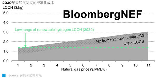 若采用CCS技术,天然气制氢的制氢平准化成本为每公斤1.32-2.88美元,具体取决于天然气价格;采用CCS技术的煤制氢成本为每公斤2.50-3.34美元,具体取决于煤炭价格。化石能源制氢气结合CCS技术的成本实则高于BNEF估算的2030年可再生能源制氢平准化成本。