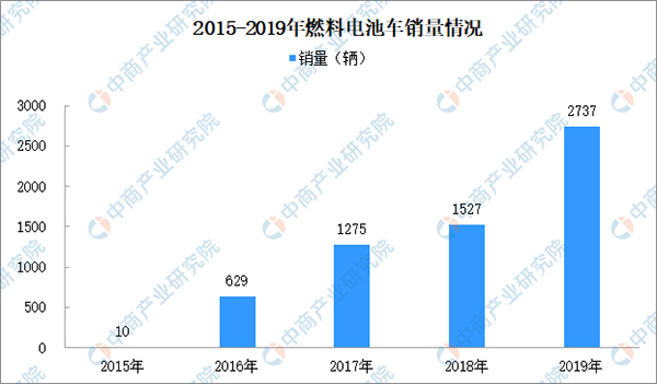 近年来,我国高度重视燃料电池汽车技术研发及推广应用。政策利好,燃料电池汽车犹如站上风口,从我国的发展情况来看,仍有很大的增长空间。数据显示,2015-2019年间,我国燃料电池汽车的销量分别为10辆、629辆、1275辆、1527辆、2737辆,2019年的销量是2015年的272.7倍。其中,2019年我国燃料电池汽车产销分别完成2833辆和2737辆,同比分别增长85.5%和79.2%,截至2019年底我国燃料电池车累计数量为6000辆。此外,有相关专家统计,在近两个月内,国内与燃料电池相关的企业新增了110家。燃料电池汽车在国内得到快速发展。