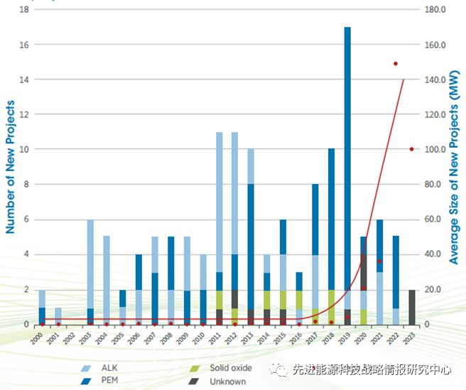 图1 2000-2023年全球新增电解制氢项目变化态势(左轴:项目数量;右轴:新项目平均规模<兆瓦>)