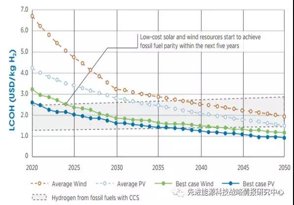 图3 风电和光伏发电制氢成本发展趋势(单位:美元/kg)