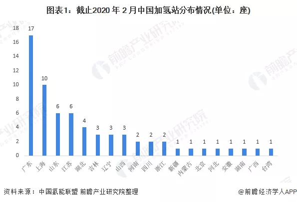 截至 2020 年 2 月,我国加氢站共有66座,仍有较大上升空间。广东省以17座的数量排在首位,其次是上海市,拥有10座加氢站。