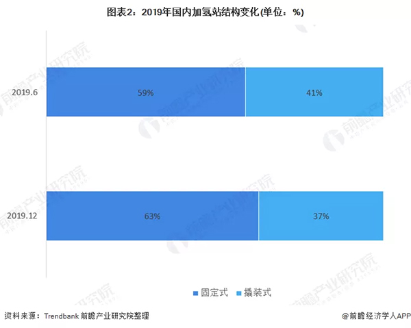 能源综合站、站内制氢加氢站是2019年的新基调,加氢站类型逐渐由内部示范运营站向能服务于未来商业化运营的商业加氢站转变,加氢站类型将多元化。目前,国内固定式加氢站数量正在逐渐增加,其比例已从2019年上半年的占比59%已上升至2019年年底的63%。另外,站内制氢油氢合建也将成未来潜力“明星”加氢站类型,更加符合用户体验的固定站数量也将逐渐增多,超高压储氢和液氢加氢站将助力未来商业化运营。