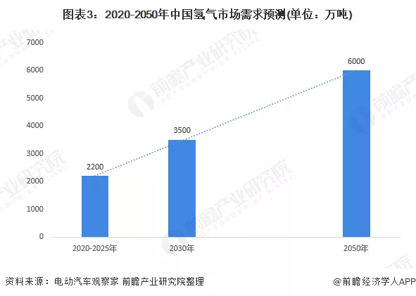 整体而言,中国氢能市场发展初期(2020-2025年左右),氢气年均需求约2200万吨;氢能市场发展中期(2030年左右),氢气年均需求约3500万吨;氢能市场发展远期(2050年左右),氢气年均需求约6000万吨。