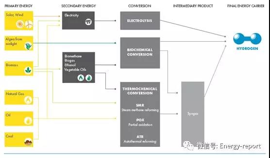 由于氢通常作为化合物的一部分存在于地球上,因此必须在特定的过程中合成氢以用作材料或能源。这可以通过不同的技术方法来实现,并且各种主要能源-化石燃料和可再生燃料,无论是固体、液体还是气体形式-都可以用于这些技术生产过程中。