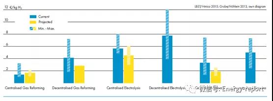 在所考虑的所有生产方法中,集中式氢气生产比小型、分散式工厂的生产更具成本效益。集中式天然气重整制氢是最具成本效益的,其每千克氢的生产成本为1~2欧元。