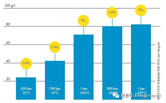 商业上最重要的是作为压缩气体的氢存储。对于最终用户,可提供不同设计(350,700bar)的高压储罐。通过液化可以实现更高的储存密度,尽管这涉及将氢气冷却至-253℃。