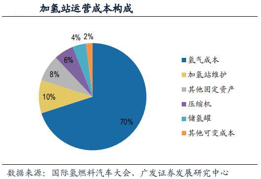 加氢站建成后,运营成本包括氢气成本、设备折旧、运营维护成本、人员工资等,其中,氢气成本占比最大,接近运营成本的70%。