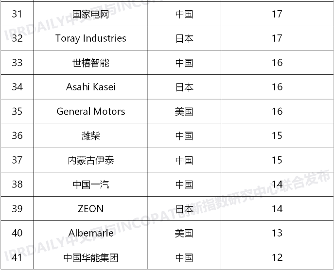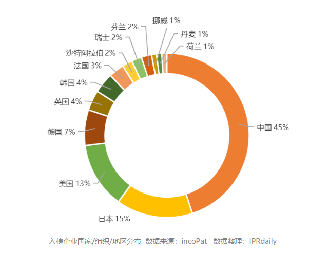 入榜前100名企业主要来自13个国家和地区,中国占比45%,其次为日本占比15%,美国占比13%,德国占比7%;英国和韩国各占比4%,法国占比3%,沙特阿拉伯、瑞士和芬兰各占比2%,挪威、丹麦和荷兰各占比1%。