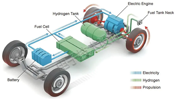 氢动力汽车将化学能转化为动能。氢内燃机汽车(HICEV)与传统内燃机工作原理相同,只是将燃料换成了氢。还有一种方法是让氢在燃料电池中与氧发生反应,从而产生电能。这种类型的汽车称为燃料电池电动汽车(FCEV),它由电动机驱动,由车载发电系统来生产和管理氢。近年来,FCEV已经越来越多地引起制造商的关注。