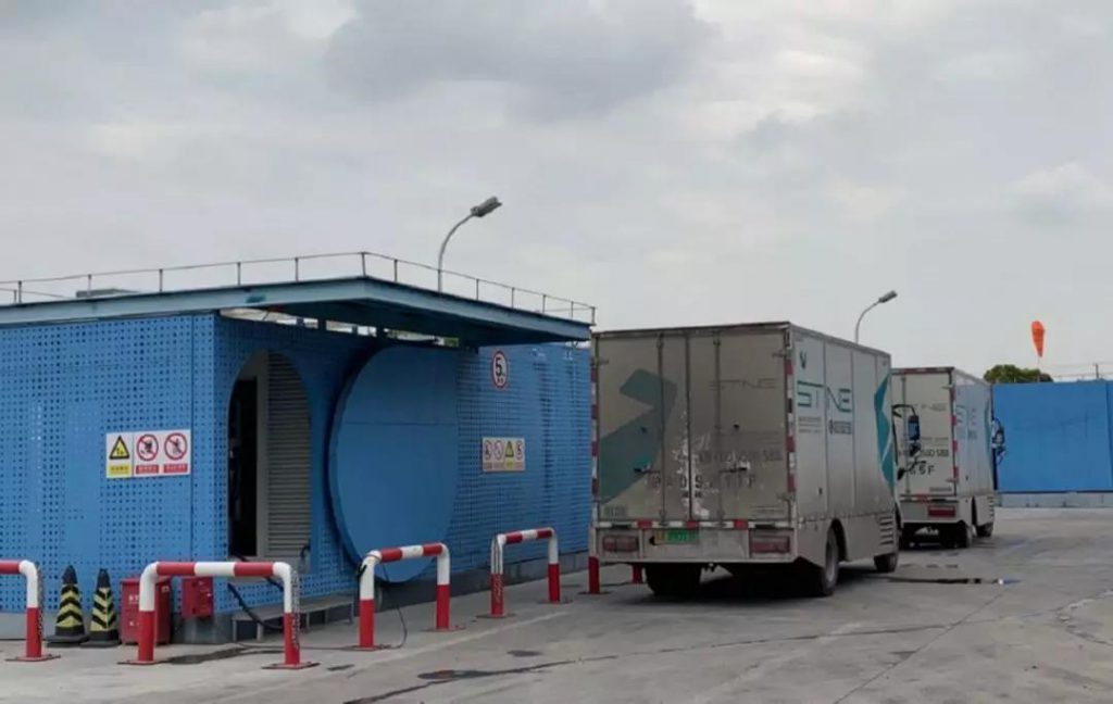 *4月11日,两辆物流车正在上海江桥加氢站排队加氢,这是中国最繁忙的加氢站