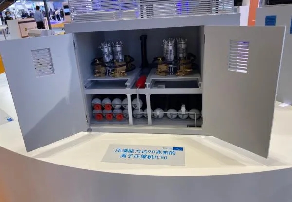 在展台上,林德展出的离子压缩机可通过5级压缩对气态氢进行压缩,压缩以后氢气被输送至下游使用,通过加氢枪为燃料电池车加注。该离子压缩机最高压力90MPa,具有集约、高效等特点,目前已引入国内。