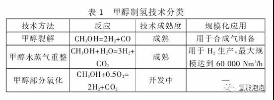 甲醇制氢技术包括甲醇裂解、甲醇水蒸气重整和甲醇部分氧化三类,具体见表1。